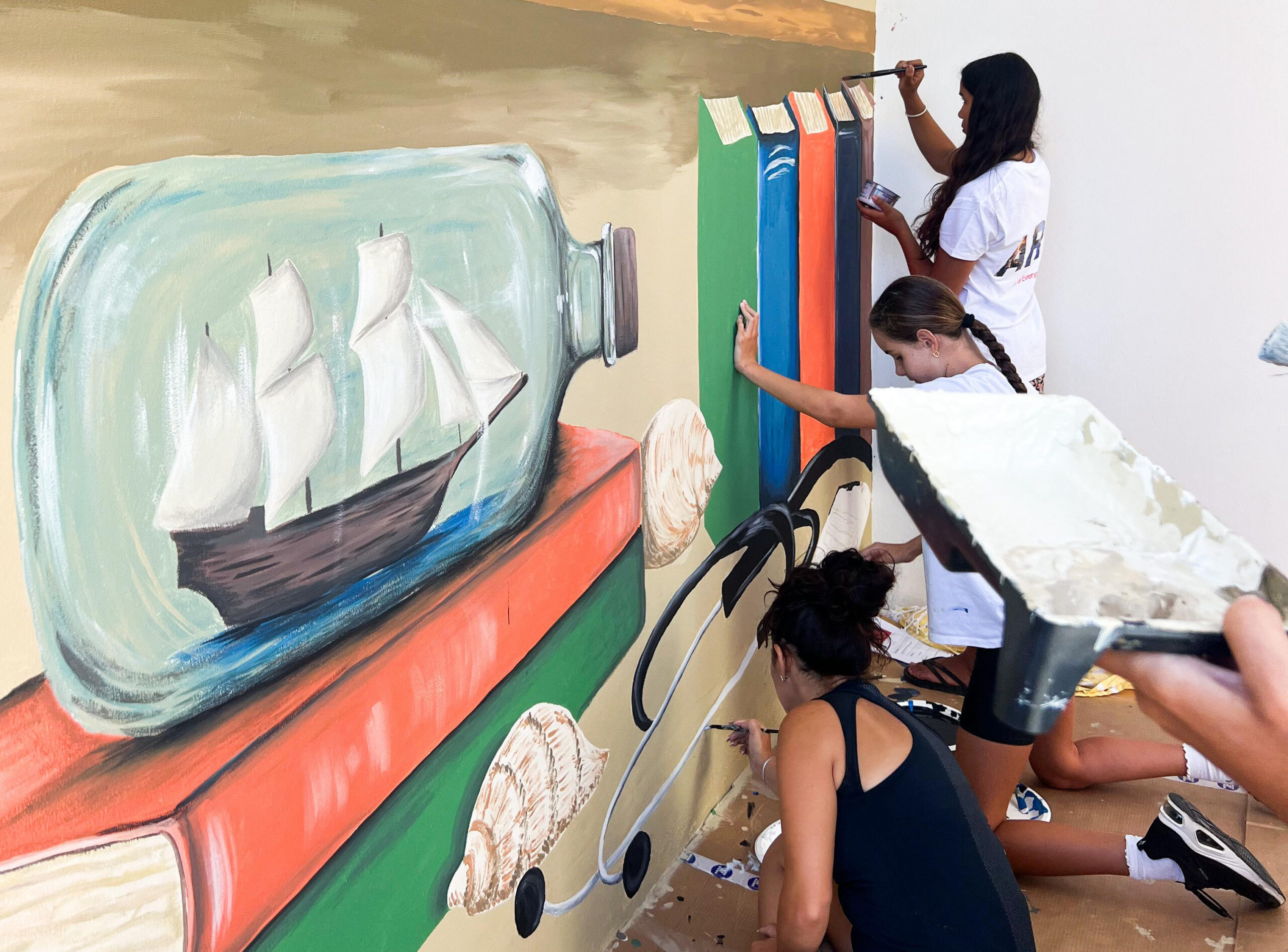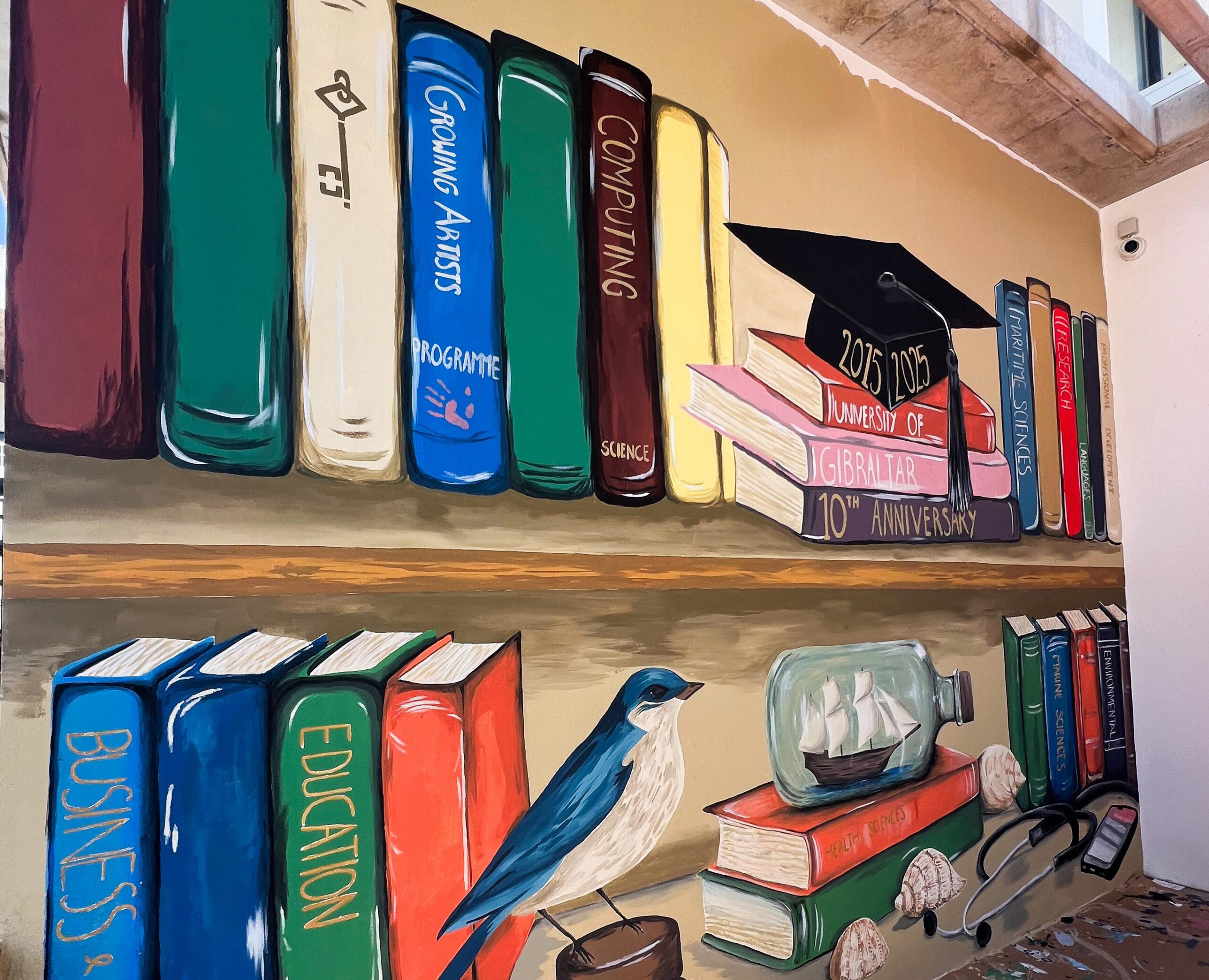 To celebrate and mark the 10th anniversary of the University of Gibraltar, our youth group spent a week over the summer creating a vibrant mural at the university’s entrance. Guided and supported by local artists Phoebe Noble and Kyrane Lia, the students worked together to design and paint a piece inspired by the iconic campus bookcase and the wide range of subjects taught at the university.