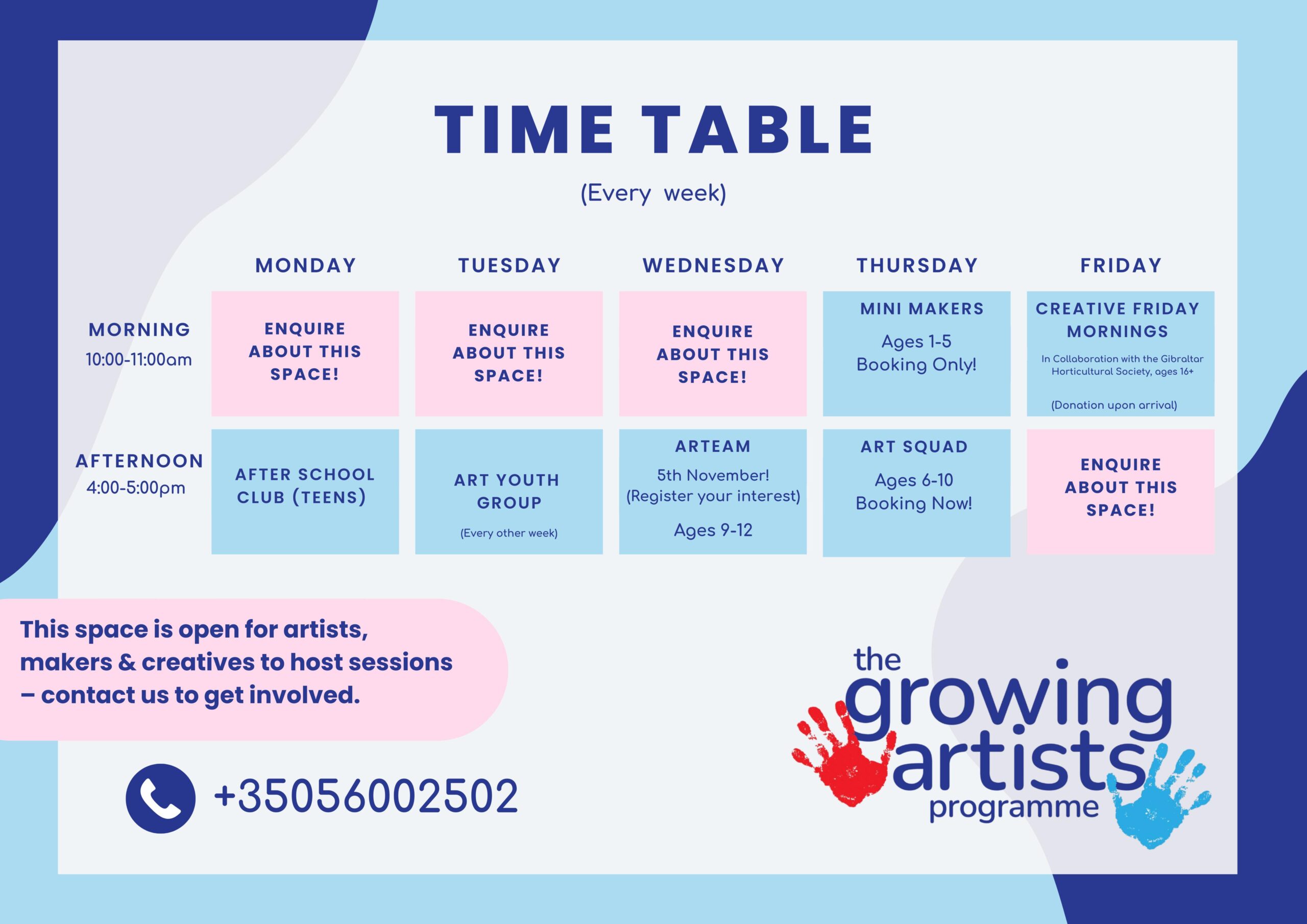 The Growing Artist Programme is based in Gibraltar dedicated to nurturing creativity in young minds through exposure to contemporary art. Our core mission is to inspire and cultivate creative thinking in children by providing them with opportunities to engage with the arts. The Growing Artist Programme unites young people of all backgrounds through weekly low cost or free workshops and groups. Participants explore diverse artistic practices, learn from local artists, and collaborate on community projects such as murals, building skills, creativity, and a love of art while enriching Gibraltar’s cultural landscape.